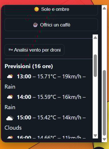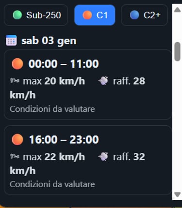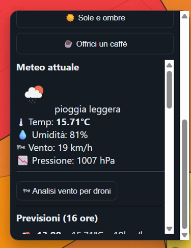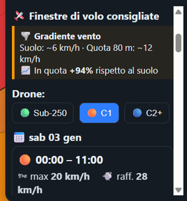Il meteo viene fornito con parametri utili alla pianificazione reale del volo, inclusa la valutazione del vento a diverse quote (es. suolo e quota operativa), permettendo di stimare gradienti e condizioni potenzialmente critiche per il tipo di drone utilizzato.
