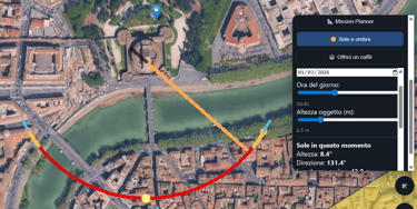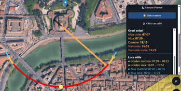 Calcolo della posizione del sole, delle ombre proiettate e delle finestre temporali utili per pianificare riprese fotografiche e video.