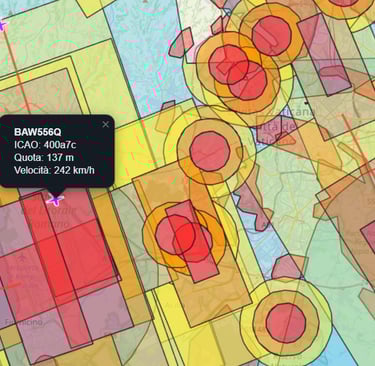 Drone Sky Check integra la visualizzazione del traffico aereo reale tramite dati ADS-B, mostrando su mappa aerei ed elicotteri in movimento nelle vicinanze dell’area di volo.